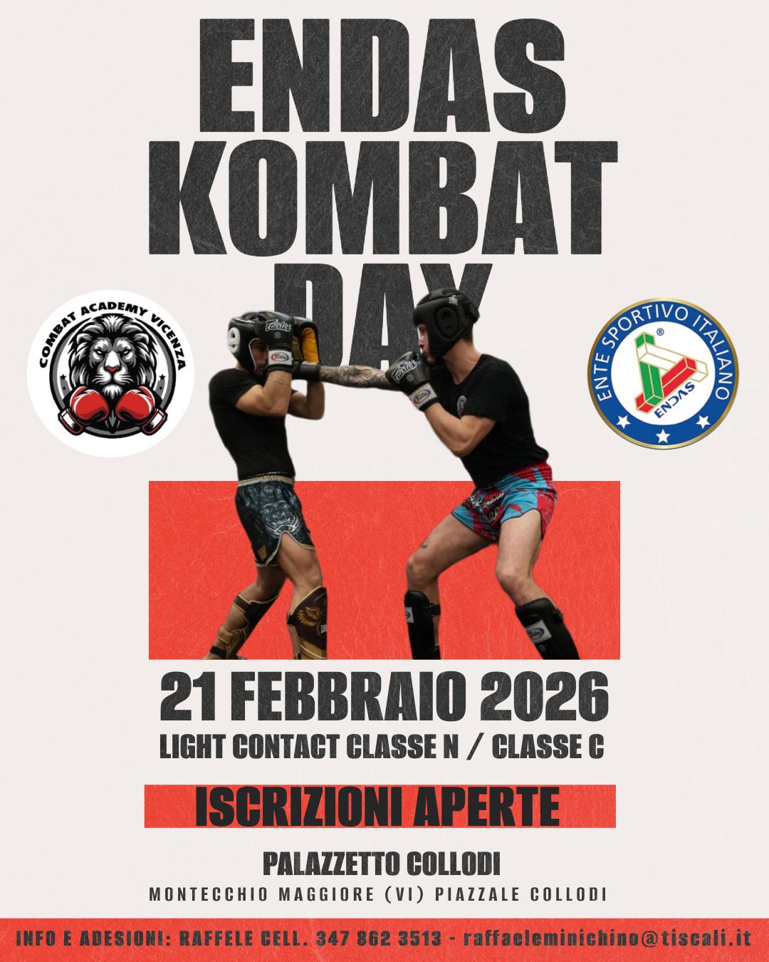 Endas Kombat Day porta sul ring l’energia degli sport da combattimento con match dilettantistici di Muay Thai e K-1. Una giornata di grande spettacolo che vedrà protagonisti atleti di tutte le età, a partire dai giovani fighter dai 10 anni, fino alle categorie adulte, nel segno di passione, rispetto e spirito sportivo.