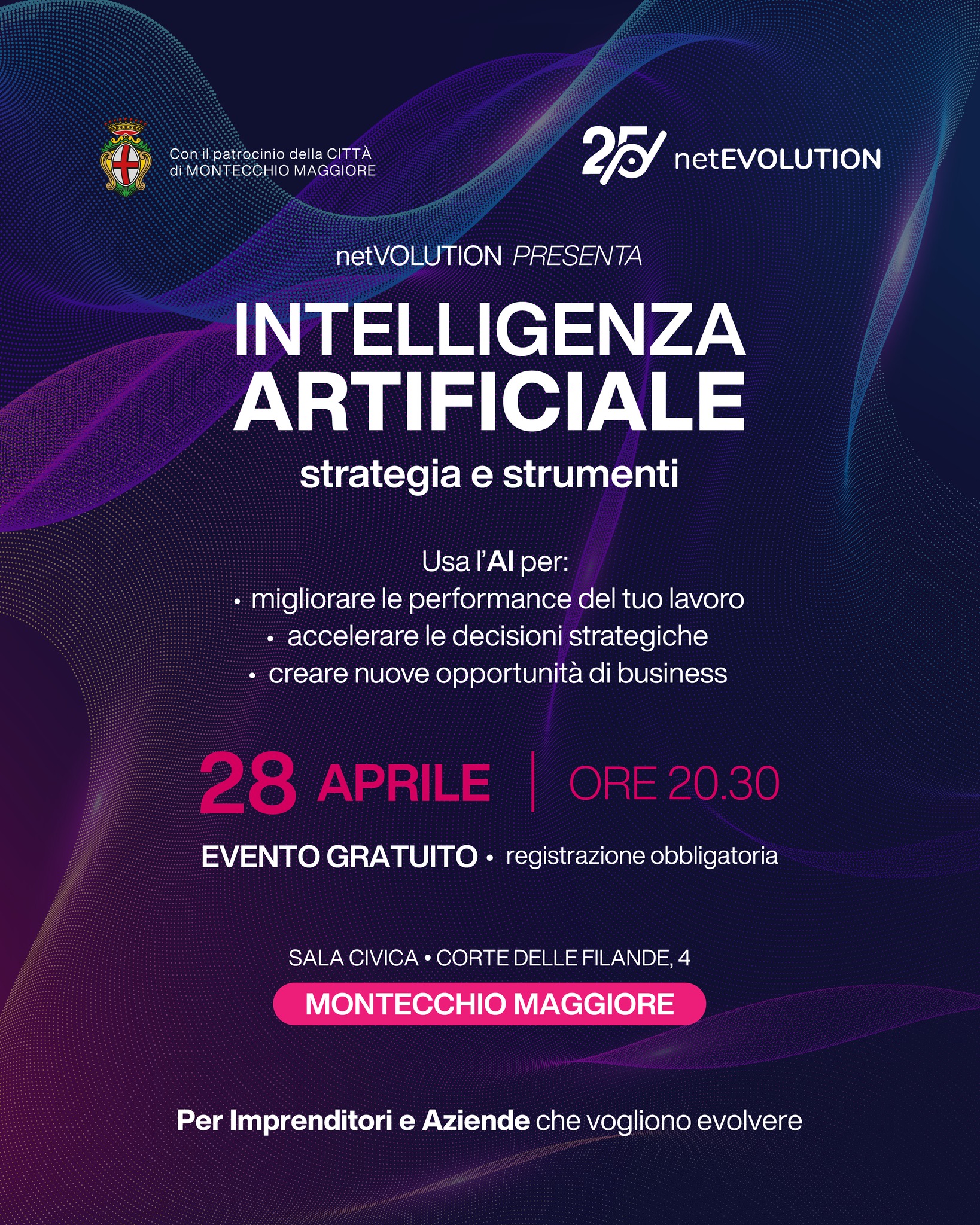 L’evento fa parte del ciclo Digital Innovations, promosso da netEVOLUTION per portare la cultura digitale nel territorio Vicentino. Si tratta di serate aperte a tutti, aziende e privati con accesso gratuito ma riservato previa registrazione. Esperti del settore approfondiranno temi attuali legati all’avvento dell’Intelligenza Artificiale, per scoprire come usare l’AI per comunicare meglio, automatizzare processi e semplificare attività complesse, con esempi pratici e strumenti reali adatti sia ad aziende che a privati.