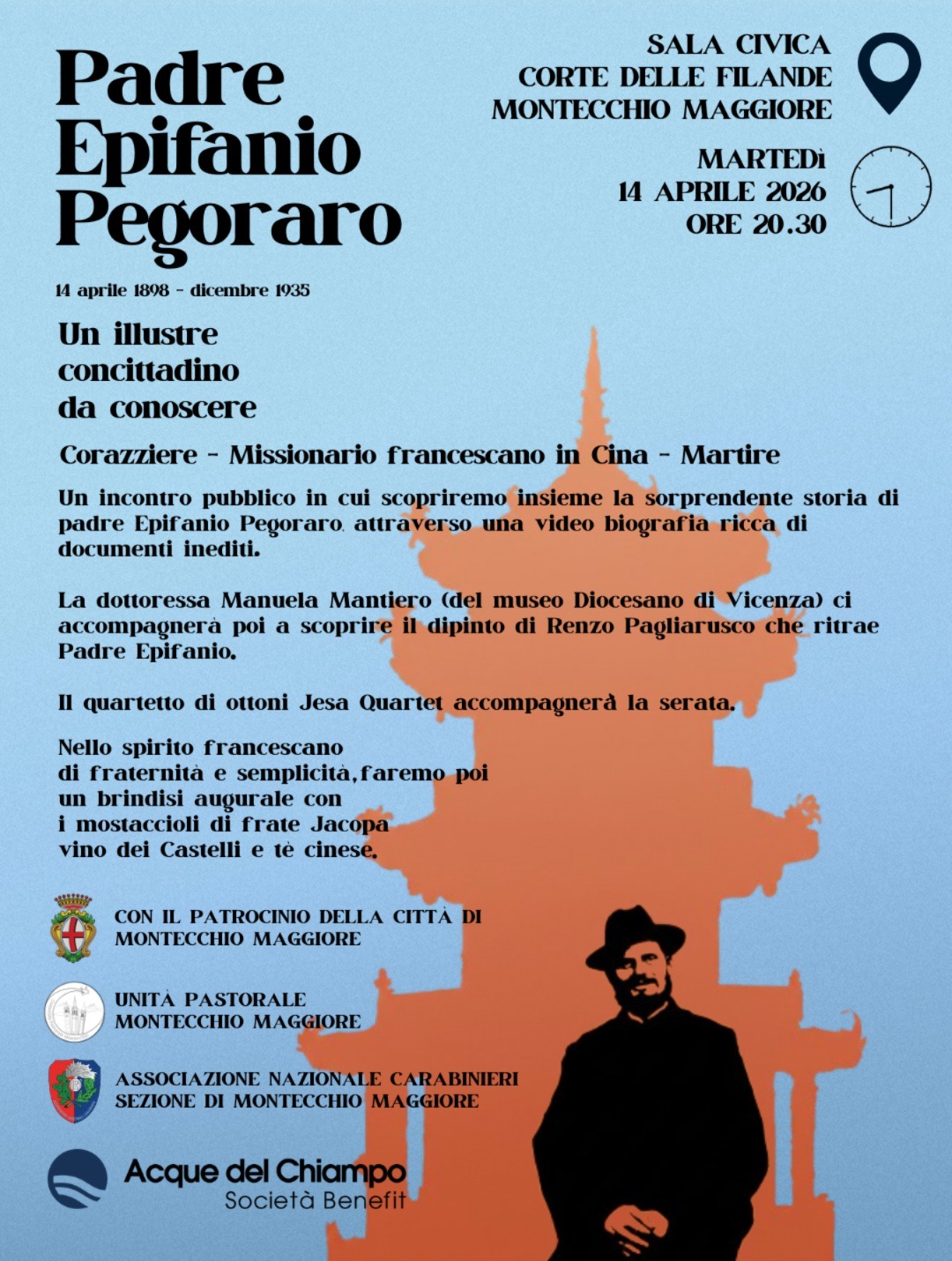 Proseguono le iniziative in memoria del Padre francescano Epifanio Pegoraro, avviate a fine 2025 in occasione del 90° anniversario del martirio del religioso e corazziere originario di Montecchio Maggiore. L’Unità Pastorale di Montecchio Maggiore, con un gruppo di volontari e il patrocinio della Città di Montecchio Maggiore, organizza per martedì 14 aprile 2026, giorno del compleanno di Padre Epifanio, alle 20.30 nella sala civica di Corte delle Filande a Montecchio Maggiore una serata dedicata alla conoscenza e all’approfondimento della figura dell’illustre concittadino. L’iniziativa è realizzata in collaborazione con la sezione di Montecchio Maggiore dell’Associazione Nazionale Carabinieri e con Acque del Chiampo.