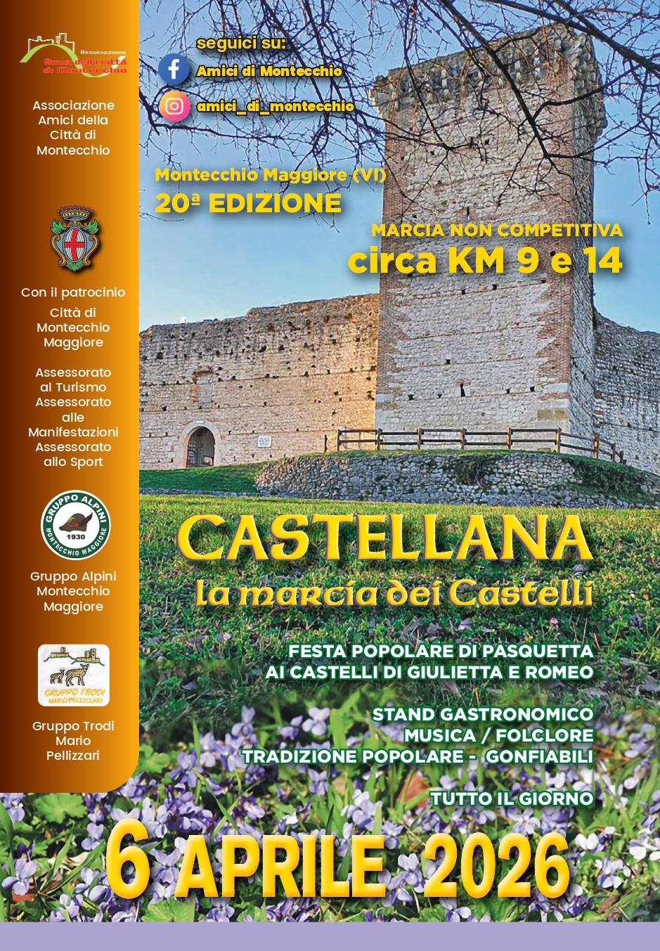 La Castellana, tradizionale marcia di Pasquetta verso i Castelli di Giulietta e Romeo, taglia il traguardo delle venti edizioni. Anche quest’anno, il lunedì dell’Angelo a Montecchio Maggiore si festeggerà sotto i due simboli della città: lunedì 6 aprile 2026 torna infatti l’evento podistico non competitivo aperto a tutti, organizzato dall’associazione Amici della Città di Montecchio con il patrocinio della Città di Montecchio Maggiore – assessorati al turismo, alle manifestazioni e allo sport – in collaborazione con il Gruppo Alpini di Montecchio Maggiore e del Gruppo Trodi Mario Pellizzari. Rinnovati i due itinerari proposti, ora lunghi circa 9 e 14 chilometri, che si snoderanno tra le contrade e i colli del territorio fino a raggiungere i Castelli. La partenza è prevista tra le 8 e le 9.30 dal Polisportivo Comunale “Cosaro” di via del Vigo, con arrivo al Castello di Romeo. Lungo il tragitto saranno allestiti punti di ristoro per tutti i partecipanti. Dalla tarda mattina è poi in programma, sempre sotto le mura del Castello di Romeo, la Festa Popolare di Pasquetta nel ricordo delle tradizioni e dei cibi locali. Fino a sera sarà attivo uno stand gastronomico tra musica, momenti di folclore e un’area con gonfiabili dedicata ai bambini.