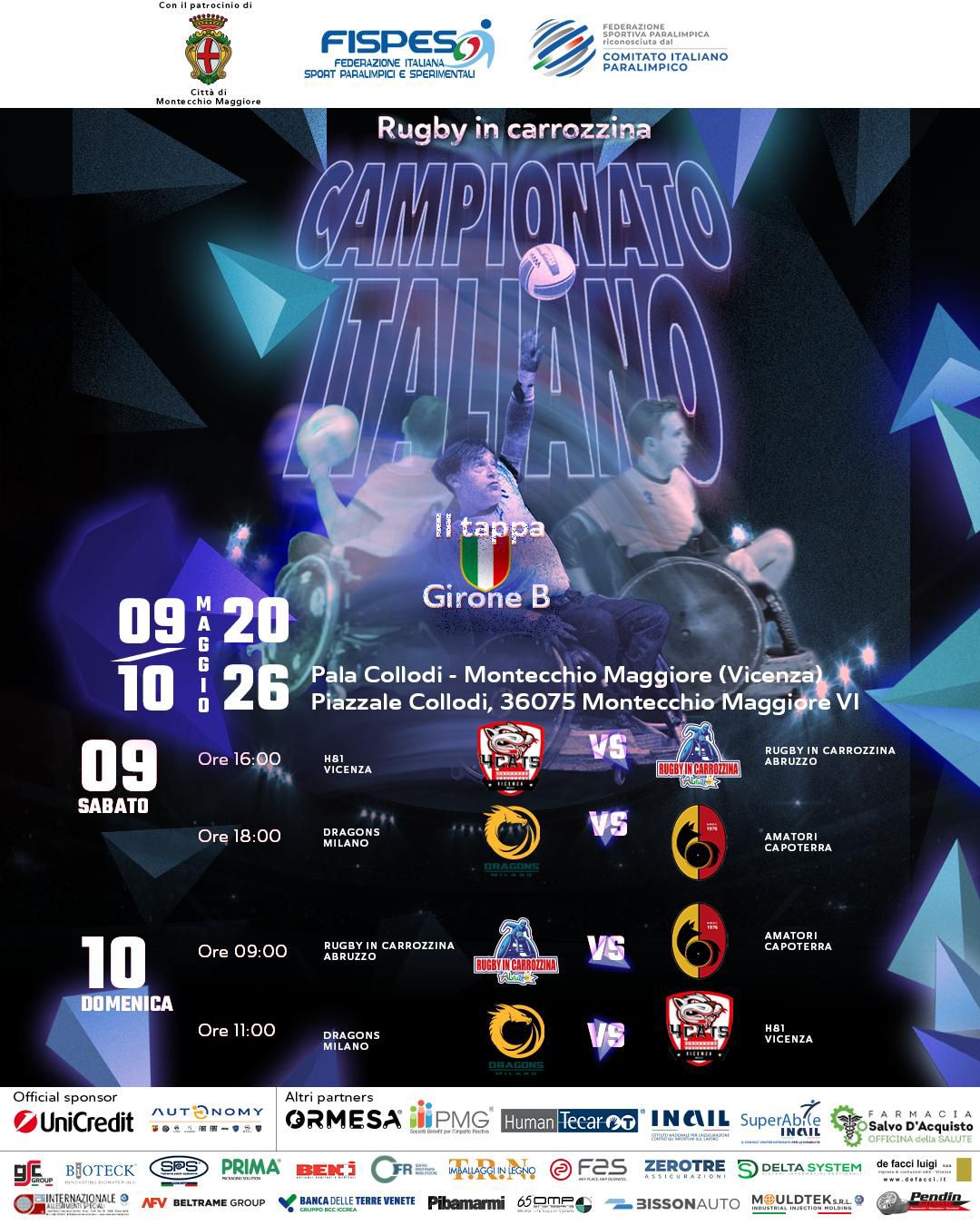 La seconda tappa del Girone B del campionato italiano di rugby in carrozzina si svolgerà a Montecchio Maggiore sabato 9 e domenica 10 maggio.