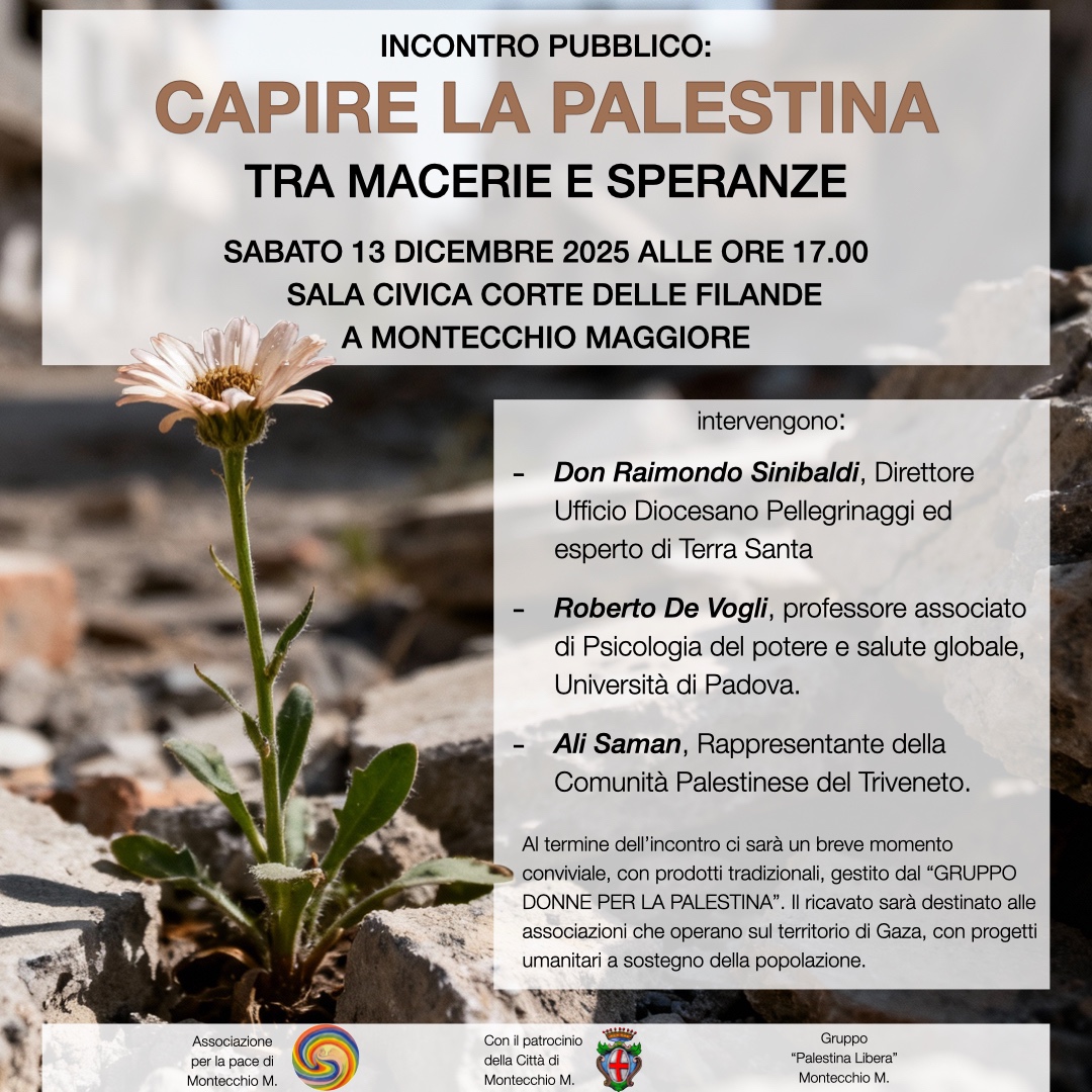 Al termine dell'incontro ci sarà un breve momento conviviale, con prodotti tradizionali, gestito dal gruppo "DONNE PER LA PALESTINA". Il ricavato sarà destinato alle associazioni che operano sul territorio di Gaza, con progetti umanitari a sostegno della popolazione.