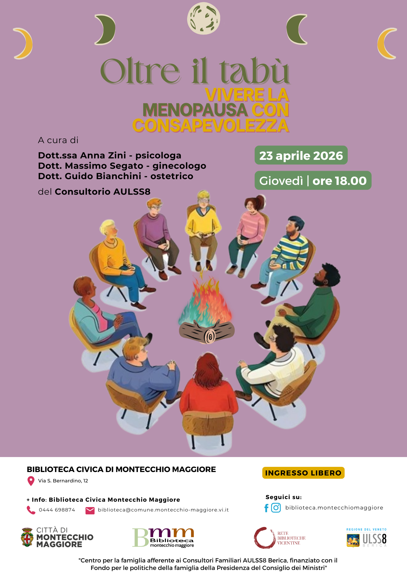 La Biblioteca Civica ospita un incontro aperto a tutti per affrontare la menopausa senza tabù: un momento di dialogo, informazione e condivisione per vivere questa fase come trasformazione e non come perdita; in collaborazione con i Consultori familiari AULSS8.