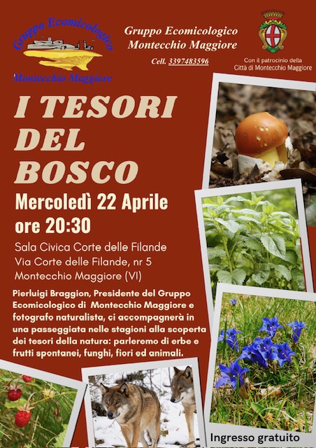 Pierluigi Braggion, Presidente del Gruppo Ecomicologico di Montecchio Maggiore e fotografo naturalista accompagnerà in una passeggiata nelle stagioni alla scoperta dei tesori della natura. Si parlerà di erbe e frutti spontanei, funghi, fiori ed animali.
