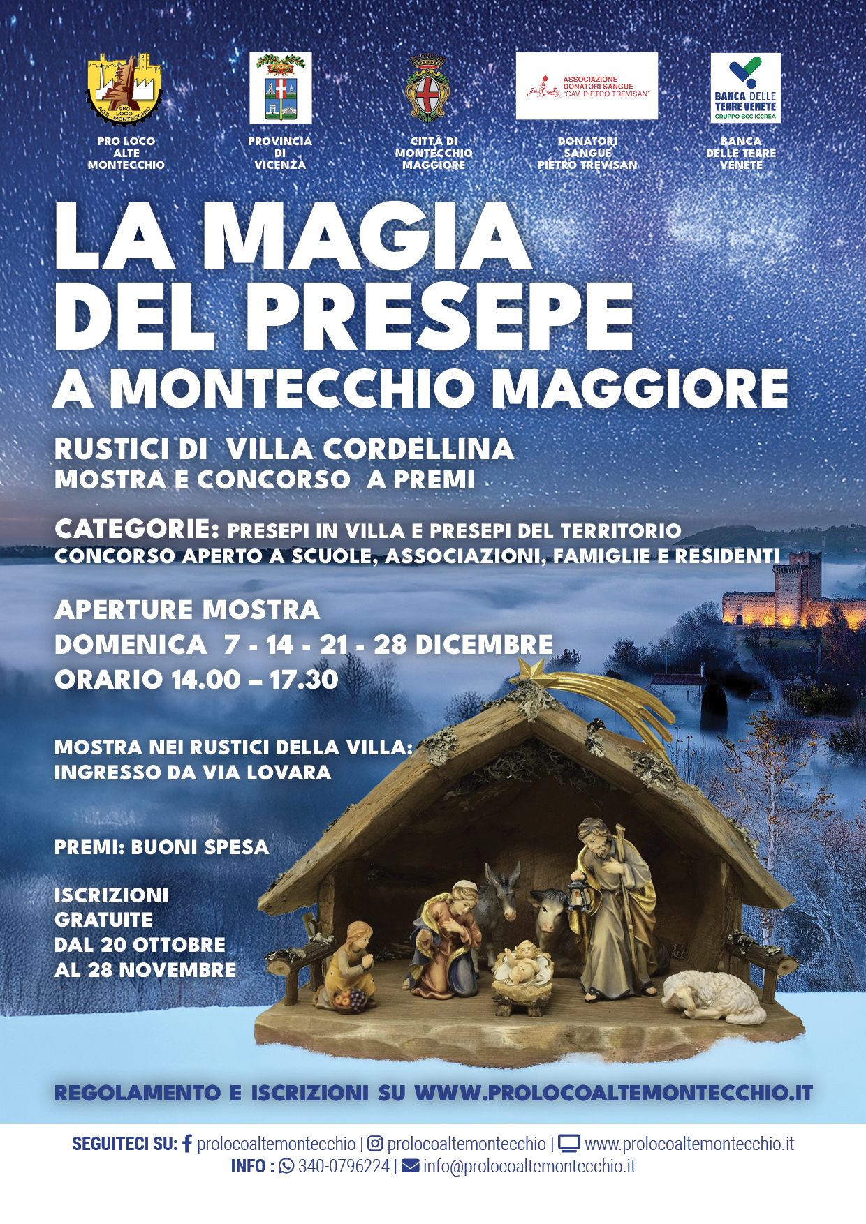 Nella mostra ospitata nei Rustici di Villa Cordellina saranno esposti i presepi, provenienti da tutta la provincia di Vicenza, che partecipano al concorso "La magia del presepe a Montecchio Maggiore" nella categoria Presepi in Villa.