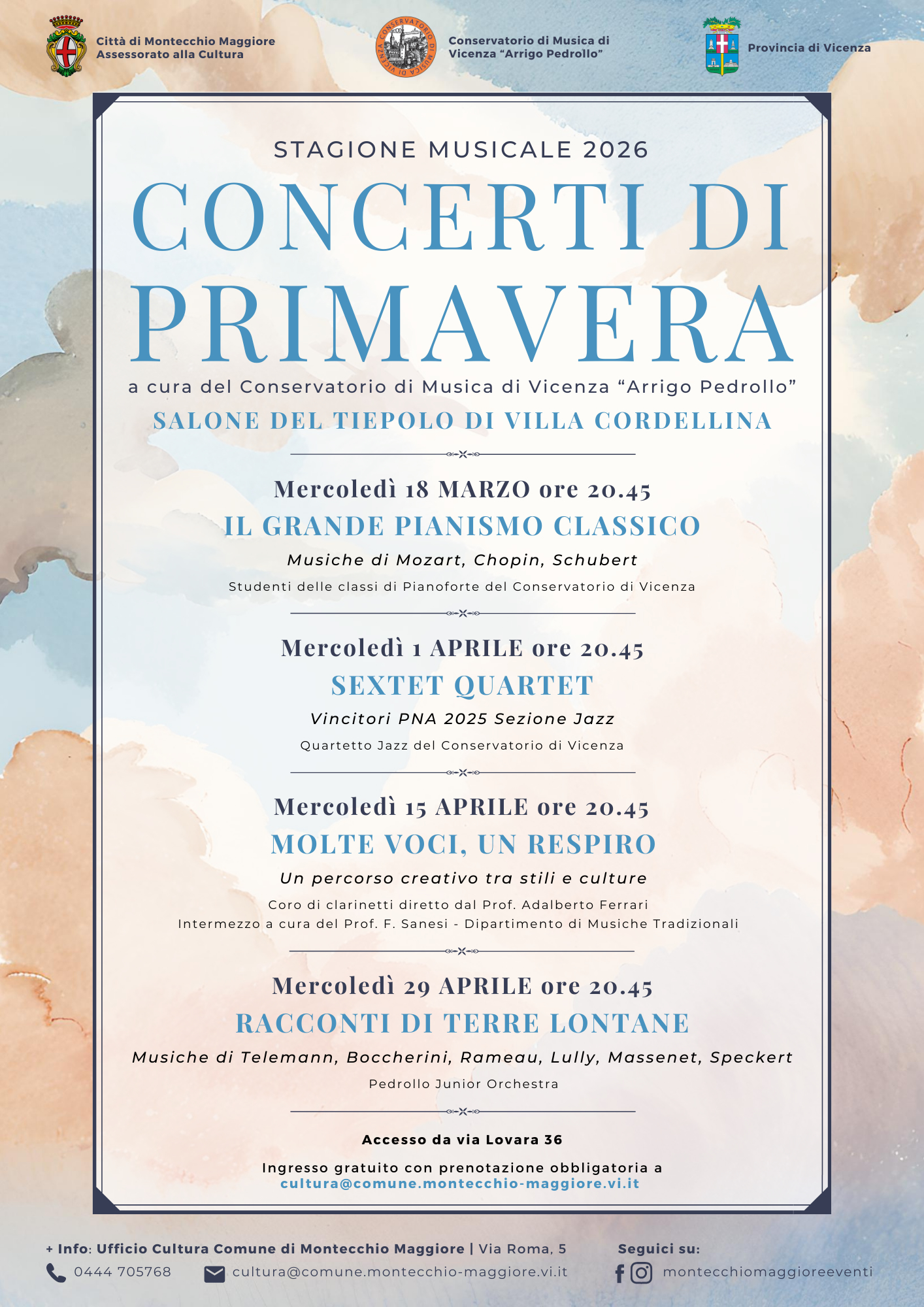 Tutti gli appuntamenti avranno inizio alle 20.45. L’accesso a Villa Cordellina è previsto da via Lovara. I concerti saranno a ingresso gratuito, con posti limitati e prenotazione obbligatoria, contattando l’Ufficio Cultura del Comune di Montecchio Maggiore.